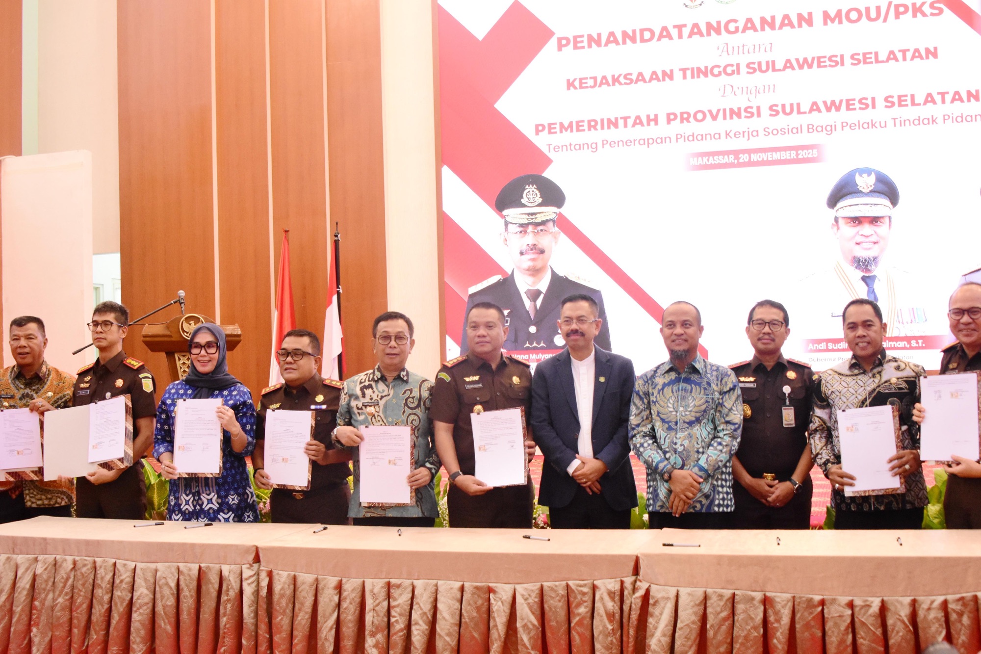 Bupati Soppeng, H. Suwardi Haseng, SE, menghadiri kegiatan penandatanganan Perjanjian Kerja Sama (PKS) terkait pelaksanaan pidana kerja sosial bagi pelaku tindak pidana. Acara berlangsung di Baruga Asta Cita Rumah Jabatan Gubernur Sulawesi Selatan, pada Kamis, 20 November 2025.
