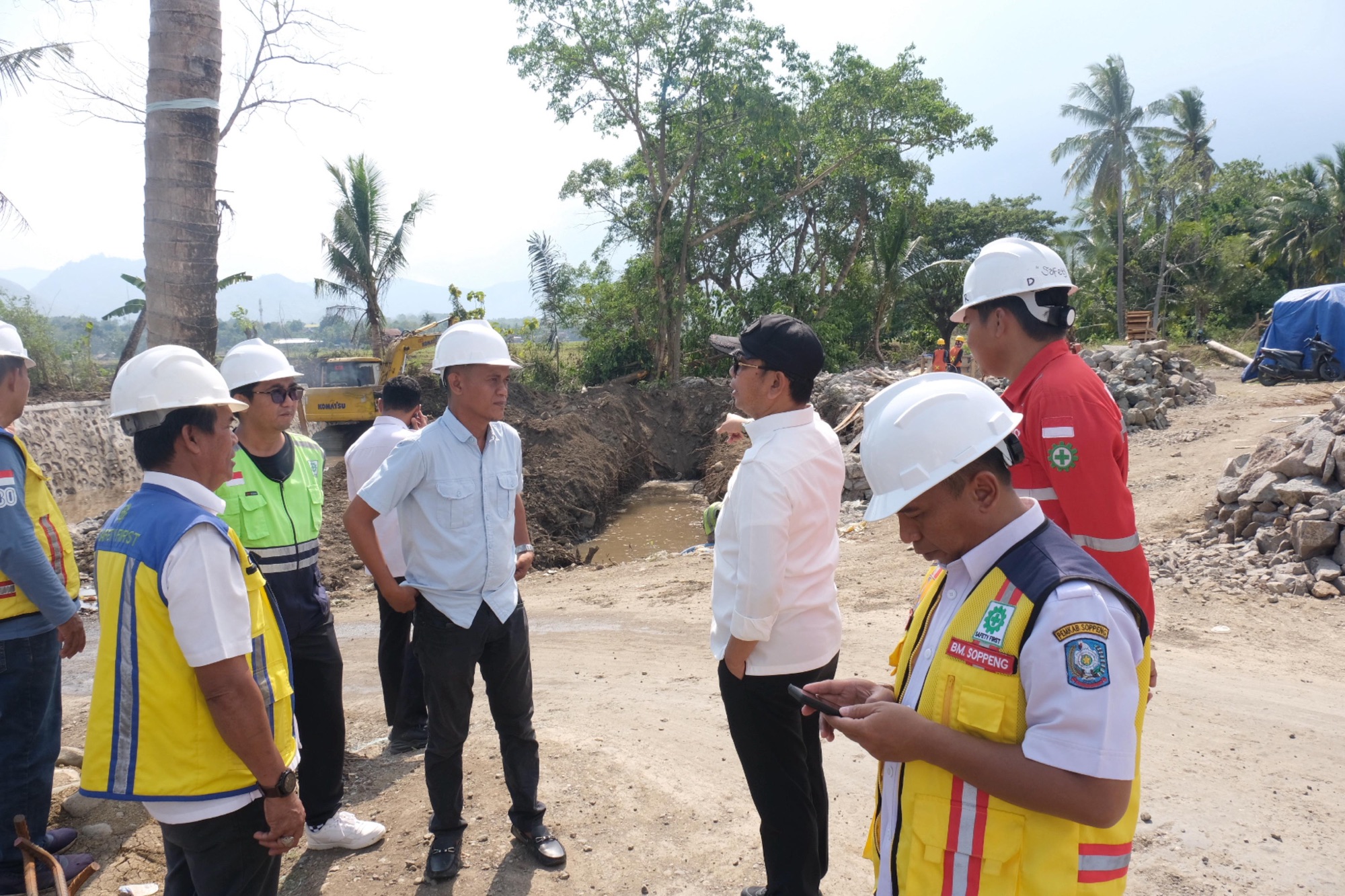 Bupati Soppeng H. Suwardi Haseng melakukan kunjungan lapangan untuk meninjau progres pelaksanaan pembangunan Jembatan Salokaraja yang berlokasi di Kelurahan Salokaraja, Kecamatan Lalabata, Kamis (9/10/2025).