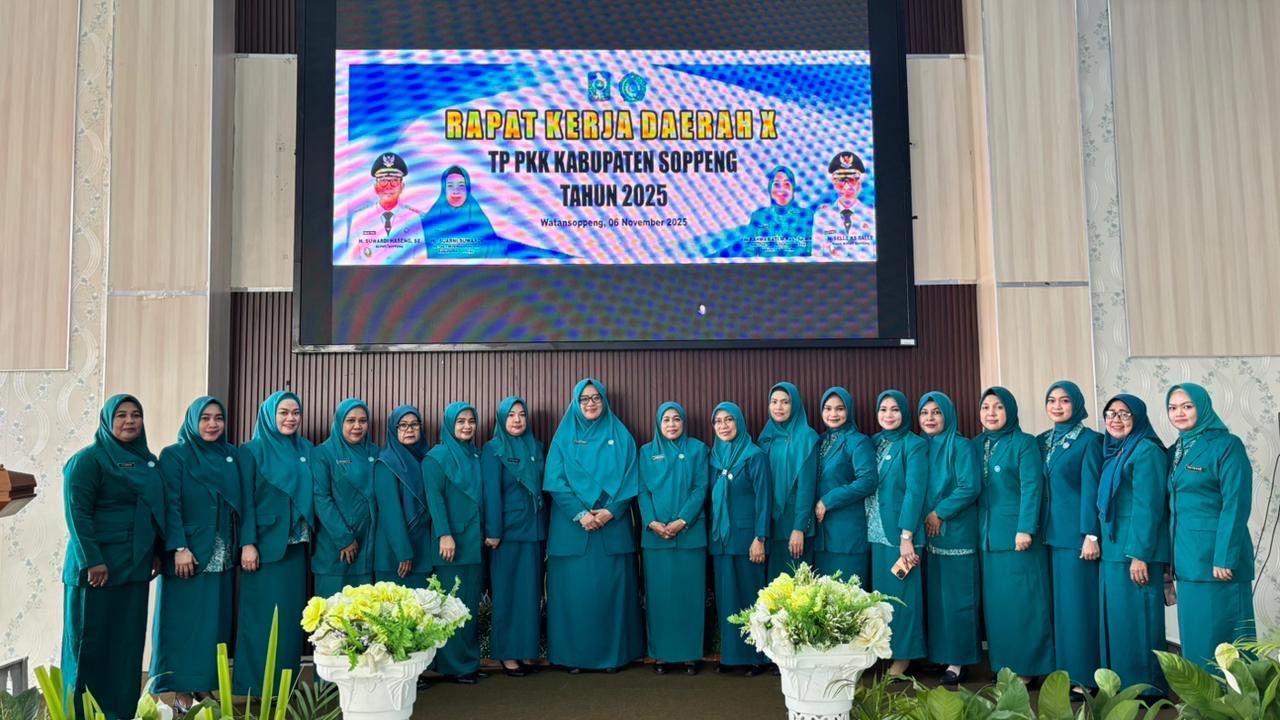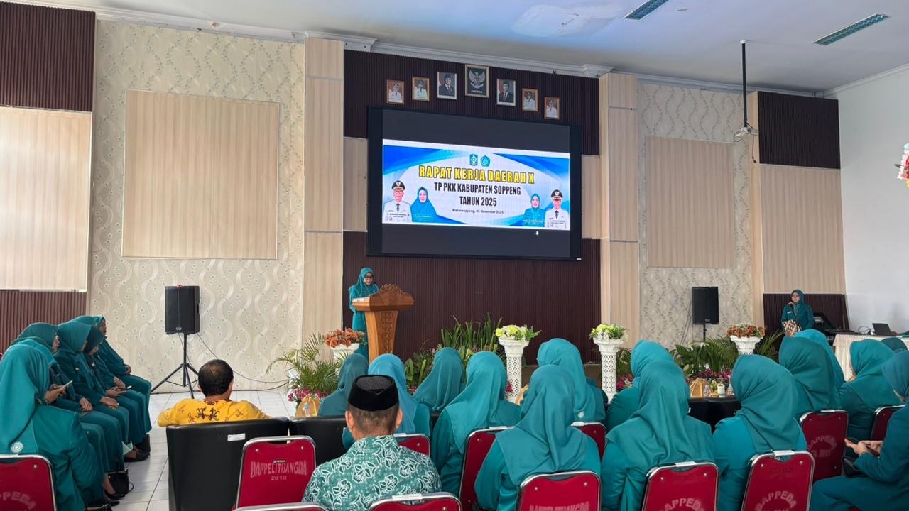 Tim Penggerak Pemberdayaan dan Kesejahteraan Keluarga (TP PKK) Kabupaten Soppeng menggelar Rapat Kerja Daerah (RAKERDA) Tahun 2025 di Aula Kantor Gabungan Dinas Kabupaten Soppeng, Kamis (6/11/2025).
