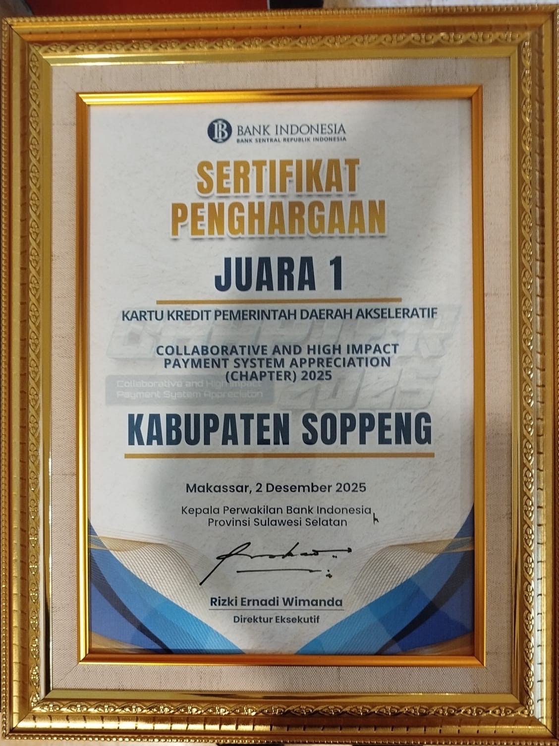 Makassar, 2 Desember 2025 — Kabupaten Soppeng kembali mencatatkan prestasi membanggakan di tingkat Provinsi Sulawesi Selatan. Pada ajang Collaborative and High Impact Payment System Appreciation (Chapter) 2025 yang diselenggarakan oleh Bank Indonesia, Pemerintah Kabupaten Soppeng berhasil meraih Juara 1 kategori Kartu Kredit Pemerintah Daerah (KKPD) Akseleratif.