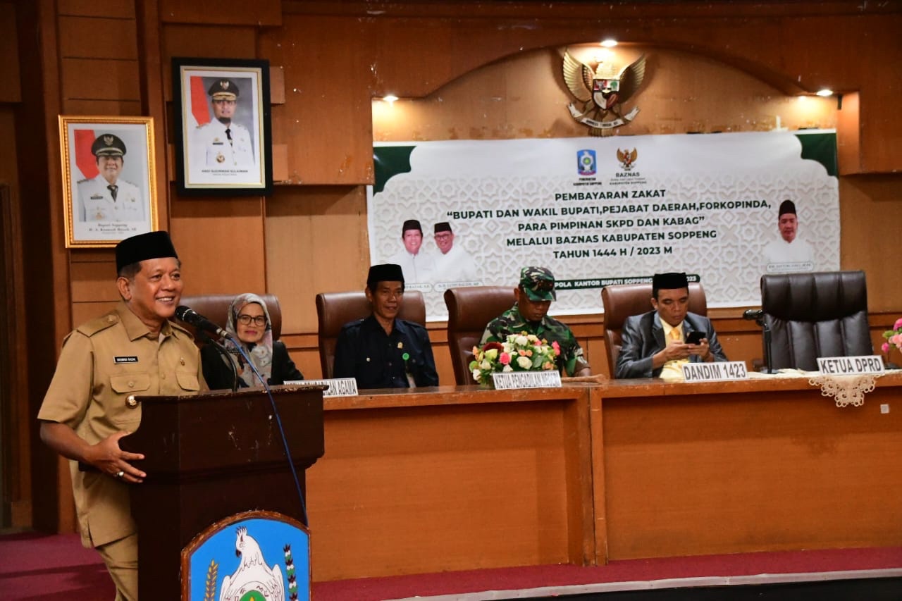 Bupati Soppeng H.A.Kaswadi Razak, SE menghadiri acara Pembayaran Zakat, Bupati, Wakil Bupati, Forkopimda, Pejabat Daerah, Para pimpinan SKPD dan Kabag, melalui Baznas Kabupaten Soppeng Tahun 1444 H/2023 M, bertempat di ruang pola kantor Bupati Soppeng. Selasa (18/4/2023)