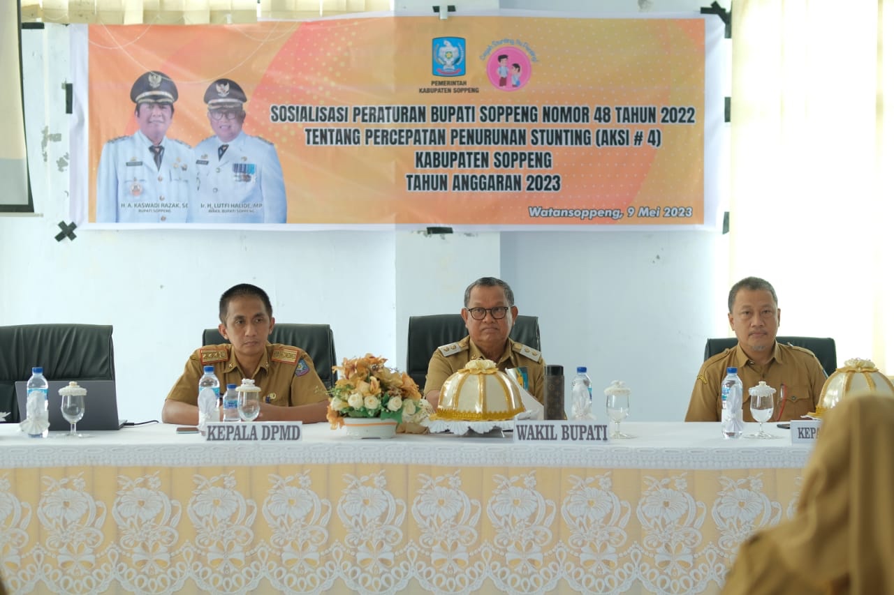 Dinas Pemberdayaan Masyarakat dan Desa melaksanakan acara Sosialisasi Peraturan Bupati Soppeng Nomor 48 Tahun 2022 tentang Percepatan Penurunan Stunting (Aksi#4) Kab. Soppeng, bertempat di Ruang Rapat Kantor Gabungan Dinas Kab. Soppeng. Selasa, 09 Mei 2023.