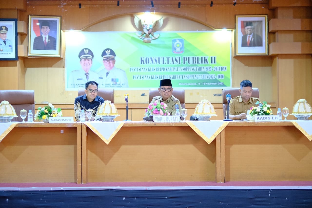 Dinas Lingkungan Hidup melaksanakan acara Konsultasi Publik II Penyusunan Kajian Lingkungan Hidup Strategis (KLHS) Rencana Pembangunan Jangka Panjang Daerah (RPJPD) Kab. Soppeng Tahun 2025-2045 dan Penyusunan KLHS Rencana Pembangunan Jangka Menengah Daerah (RPJMD) Kab. Soppeng Tahun 2025-2030, bertempat di Ruang Pola Kantor Bupati Soppeng. Selasa, 14 November 2023.